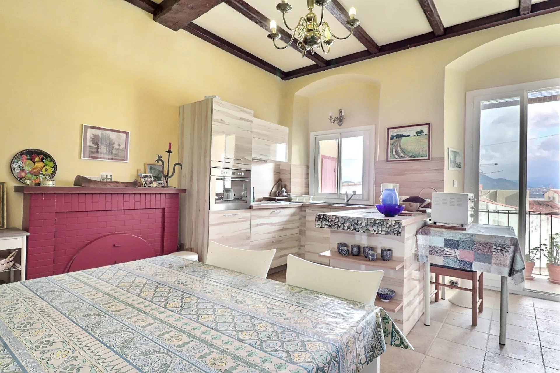 • Une cuisine indépendante dinatoire avec balcon, offrant une vue dégagée au-dessus des toits de la vieille ville et une petite échappée mer !